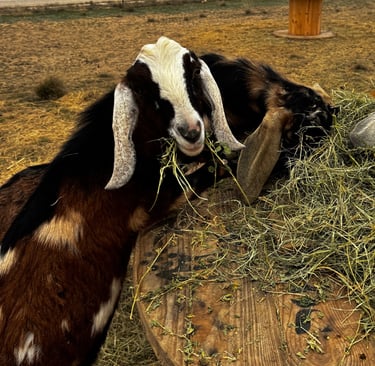 Our goats live in a spacious and safe environment where they can explore, play, and socialize with one another. Goats are incredibly social animals, and providing them with opportunities to interact is vital for their emotional health. We offer various structures for climbing, as well as toys and obstacles that stimulate their curiosity and playfulness. At the end of the day, caring for our goats is not just about meeting their basic needs; it is about cultivating a healthy, happy, and thriving herd. We believe that by providing them with high-quality nutrition, preventive health measures, and an enriching environment, we can ensure their well-being while also enjoying the beautiful companionship they provide. Each goat has its own personality, and it is a joy to watch them flourish in our care.