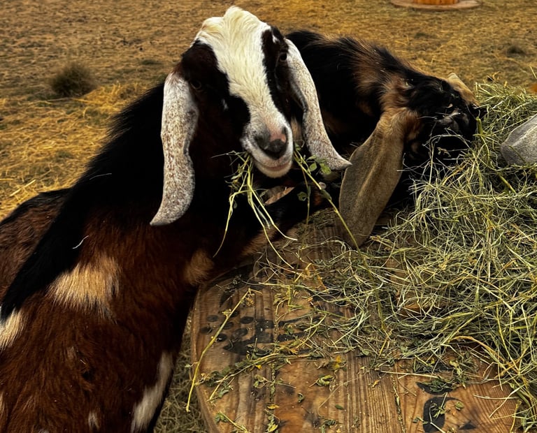 Caring for our goats is a labor of love that requires a careful balance of nutrition, health management, and environmental enrichment. At our farm, we prioritize the well-being of our goats by ensuring they receive a diet rich in high-quality forage and appropriate supplements. Our goats enjoy a diverse range of forages, as we provide them with premium hay varieties such as Sudan, chaff, coastal, and alfalfa. These hays are not only essential for their daily nutritional intake, but they also contribute to their overall health by providing necessary fiber and promoting proper rumination. We understand that variety is crucial for their dietary satisfaction and health, which is why we offer these different types of hay. In addition to hay, we complement their diet with a mix that includes grain, beet pulp, black oil sunflower seeds, and pumpkin seeds. Each of these components serves a specific purpose. The grain provides concentrated energy while the beet pulp acts as a fantastic source of digestible fiber, ensuring our goats maintain optimal digestive health. Furthermore, the black oil sunflower seeds and pumpkin seeds are rich in essential fatty acids and offer valuable nutrients that contribute to a shiny coat and overall vitality.